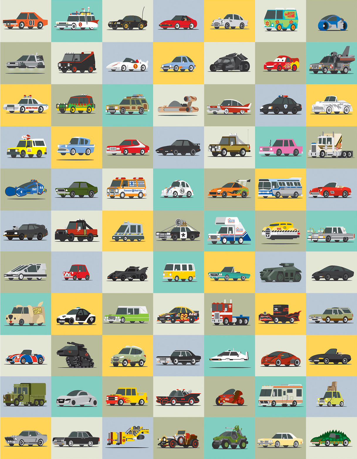 77 illustrations des plus célèbres voitures du cinéma, de la tv ou des jeux vidéo!