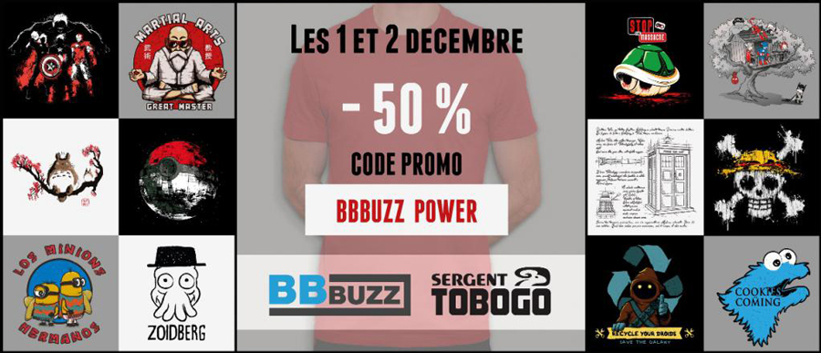 Les 1er et 2 décembre, ajoutez le code Promo BBBUZZ POWER pour bénéficier de 50% de réduction sur votre commande. L’occasion de se faire plaisir et de commander des t-shirts que vous ne trouverez pas à tous les coins de rue.