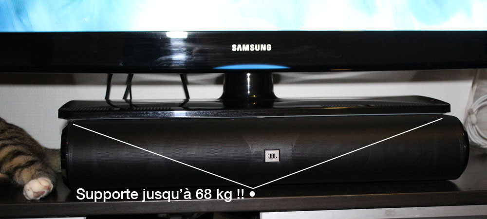 Comme vous avez pu le voir, l’originalité et le point fort du cinema base, c’est son design unique qui lui permet de se placer sous la tv et diminuer au maximum la place utilisée. Plus d’enceintes éparpillées, le cinema base est un 3-en-1. Un ampli, des enceintes et un caisson de basses en une seule boite. Je vous entends déjà « Mais ça doit être pour les petites tv ça… ». Non, le cinema base avec sa solitude structure, peut supporter jusqu’à 68 kg soit l’équivalent d’une télévision de 60 pouces soit plus de 150 cm de diagonale. Pour information, ma vieille télévision lcd de 46 pouces fait presque 36 kg et son poids n’a posé aucuns problèmes au cinema base. De plus, grace au poids de votre télévision, le cinéma base va être compressé, plaqué au meuble et permettre aux basses situées des deux cotés d’être plus puissantes en sortie, de moins trembler.