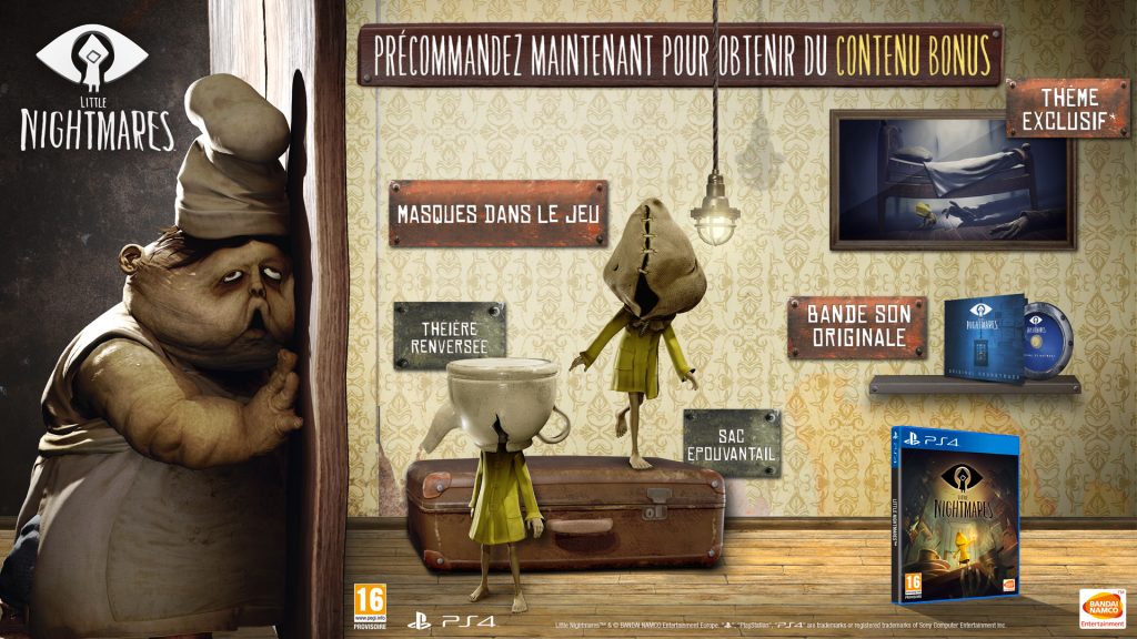 Si comme moi, vous êtes déjà sous le charme de Little Nightmares, sachez qu’il y aura à sa sortie de belles éditions collectors. Tout d’abord, si vous précommandez votre édition de Little Nightmares en dématérialisée sur PlayStation 4, Xbox One ainsi et sur PC, vous recevrez les masques épouvantail et théière renversée, pour aider Six à se fondre au milieu des autres habitants de l’Antre. Les joueurs PC et PS4™ auront également droit à la bande originale au format numérique et à un thème PS4™ ou un fond d’écran PC exclusif du concierge.