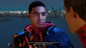 Nous nous retrouvons donc plongé directement quelques mois (un an précisément) après les évènements de Marvel’s Spider-Man sortit en 2018. D’ailleurs, pour nous remettre dans le bain, Insomniac Games nous propose un très bon résumé des évènements précédents que bien sur, nous pouvons zapper si besoin. 1 an après avoir été mordu par une araignée et après avoir développé « pratiquement » les mêmes pouvoirs que Peter Parker, Miles Morales est devenu officiellement un second Spider-man qui protège New-York, « la Ville qui ne dort jamais ». À deux, ils protègent les habitants de New-York des menaces quotidiennes. Peter Parker, devant les aptitudes toujours plus impressionnantes de Miles, va lui annoncer qu’il lui confie New York pendant qu’il part en Europe avec Mary-Jane pour le Daily Bugle. Miles Morales va alors officiellement devenir LE Spider-Man de New-York et devoir seul les protéger. Nous allons donc le suivre dans son apprentissage de Super-héros en solo face à d’anciennes menaces comme Wilson Fisk et des nouvelles comme Roxxon et sa puissante énergie Nuform ou alors ce nouveau groupe terroriste, l’Underground. Une aventure riche en rebondissement qui nous fera croiser la route Rhino ou encore du Rôdeur que nous avons pu découvrir dans le film Spider-Man: Into the Spider-Verse.
