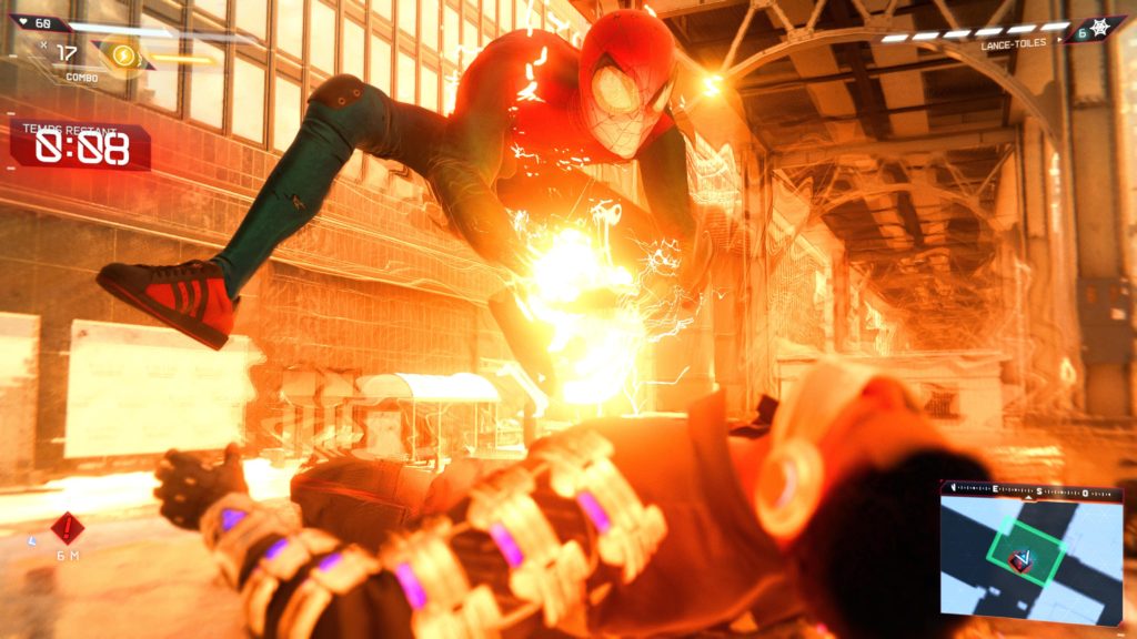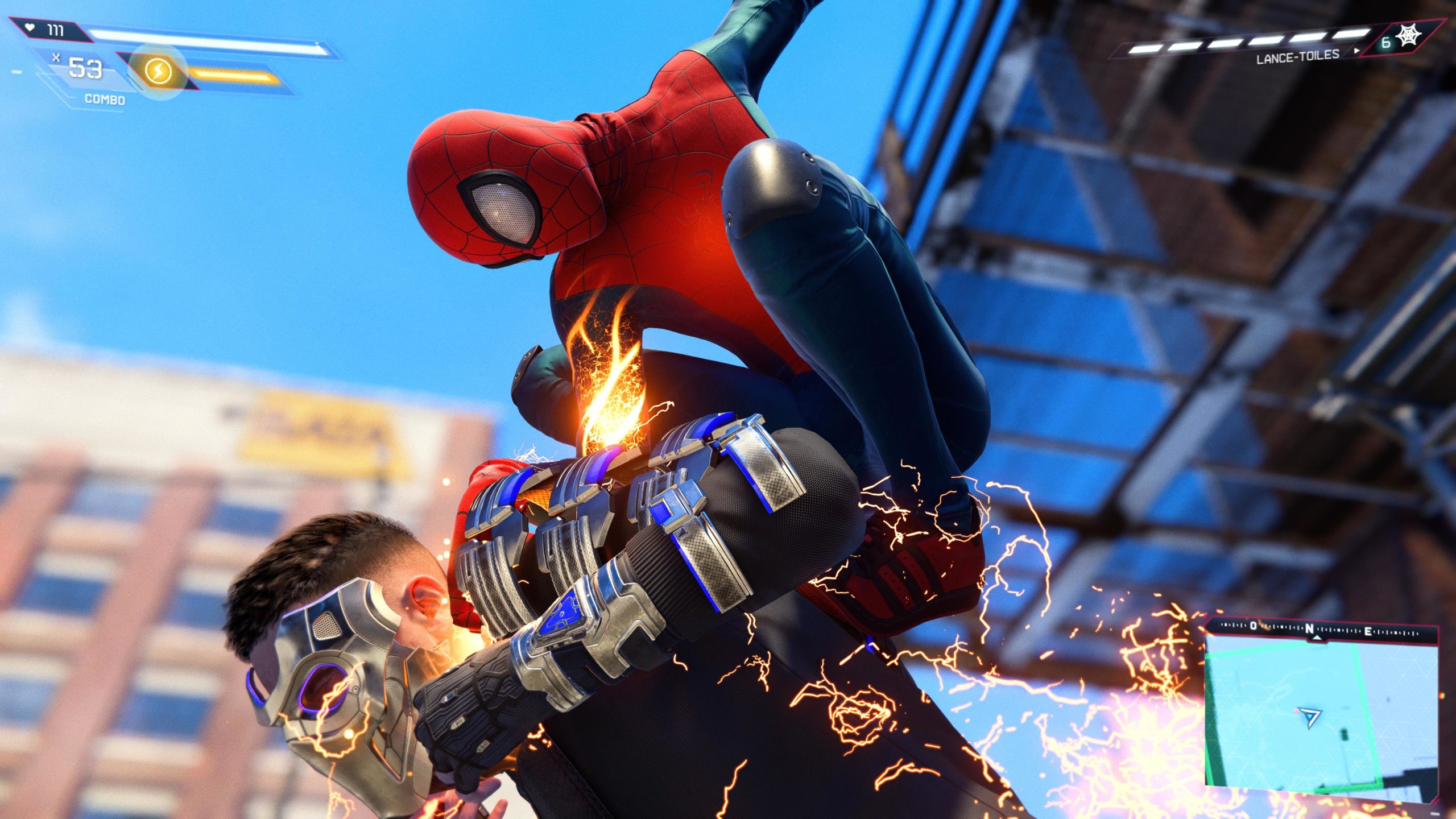 Le gameplay de Marvel’s Spider-Man m’avait déjà entièrement conquis et il n’a que très peu changé dans Marvel’s Spider-Man: Miles Morales. Il est toujours aussi simple et jouissif de se balancer d’un immeuble à l’autre avec ses toiles. Des déplacements si agréables que je n’ai même JAMAIS utilisé le déplacement rapide dans la map avec le métro. Pourquoi prendre le métro quand tu peux slalomer entre les buildings et faire des pauses pour aider les habitants de New-York ? Lors des combats, tout est toujours aussi fluide. Les attaques comme les esquives s’enchainent à la perfection tout comme les combos et les « finish-moves ». Pourtant, sur le papier, ça aurait pu être plus compliqué car contrairement à Peter Parker, Miles Morales peut utiliser un camouflage et bioélectricité, ce qui ajoute un nombre significatif de mouvements à son catalogue. Pourtant, les réflexes viennent vites et jamais on ne cherche ses coups.