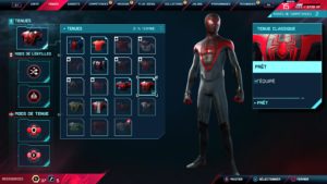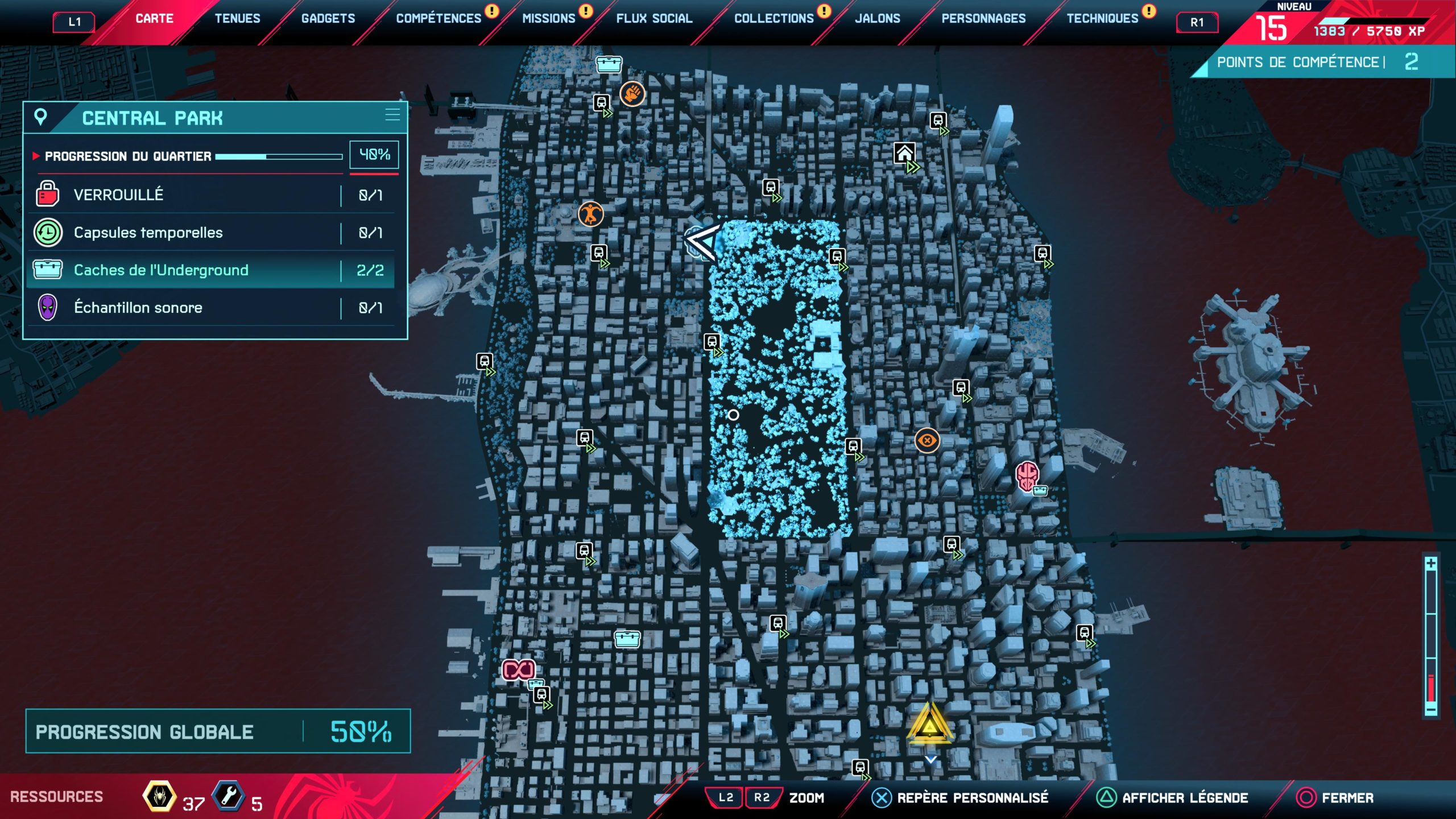 En cliquant sur votre pavé tactile de la DualSense PS5, vous avez accès au cœur du jeu avec une interface très complète pour subvenir à tout vos besoins. La carte se dévoile avec toutes les quêtes secondaires et primaires. Vous pouvez alors y zoomer et mettre des repères personnalisés. Dans cette interface, vous aurez aussi accès aux différentes tenues de Miles Morales (GROSSE préférence pour celle du film Spider-Man Into The Spider-verse), à ces gadgets, à notre très riche arbre de compétence, aux collections, aux personnages et aux techniques débloquées si vous oubliez les combinaisons de touches.