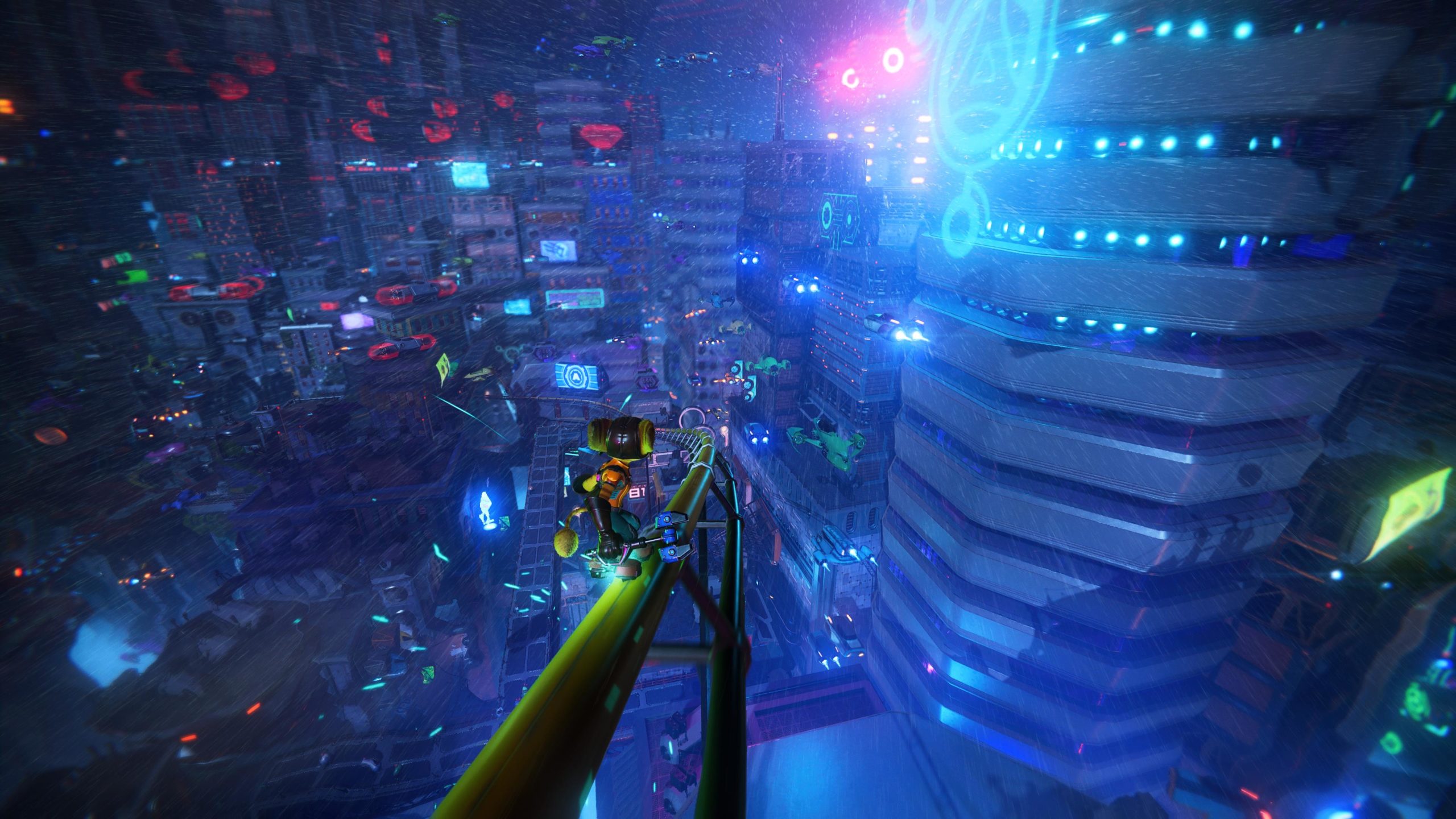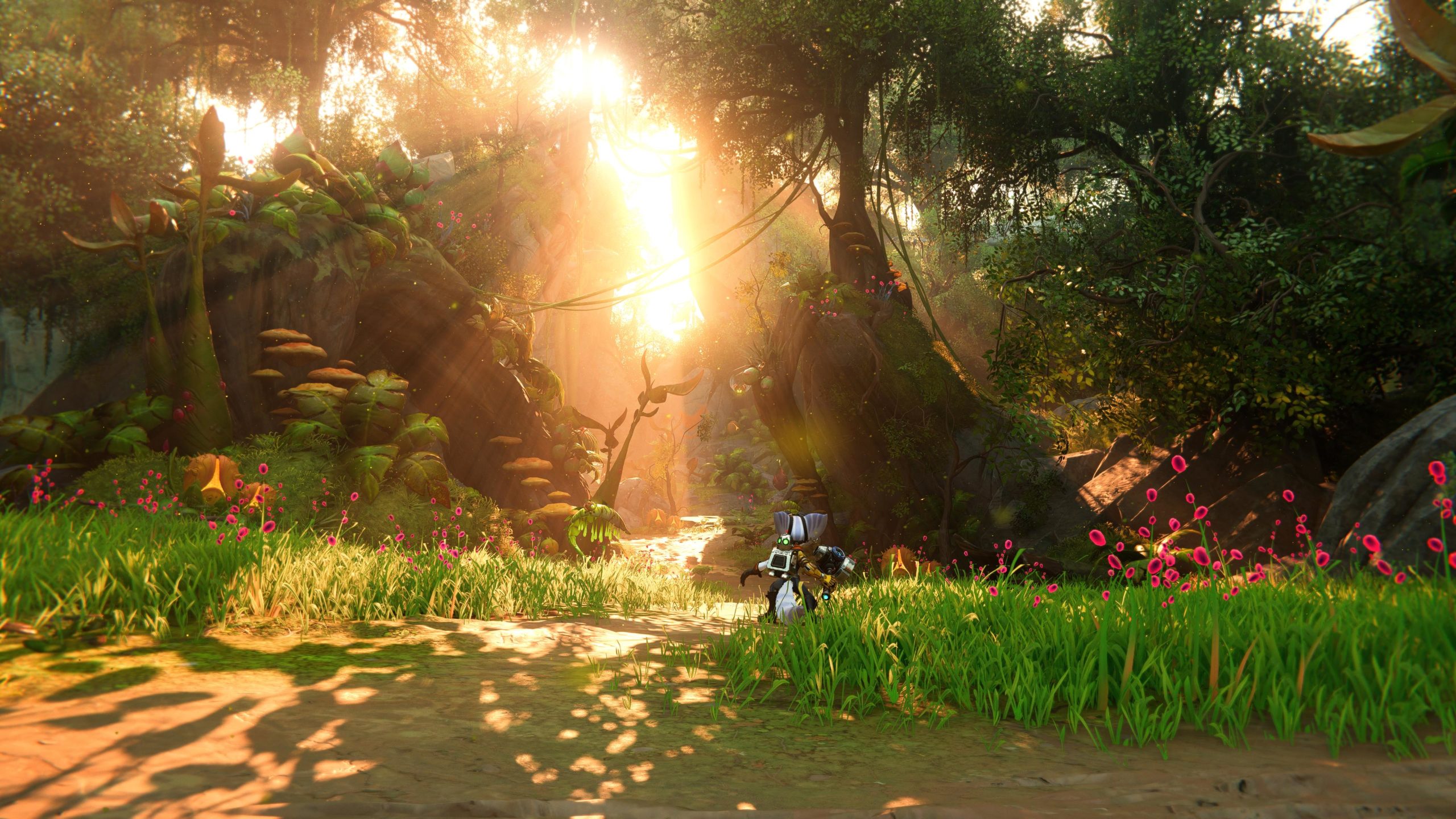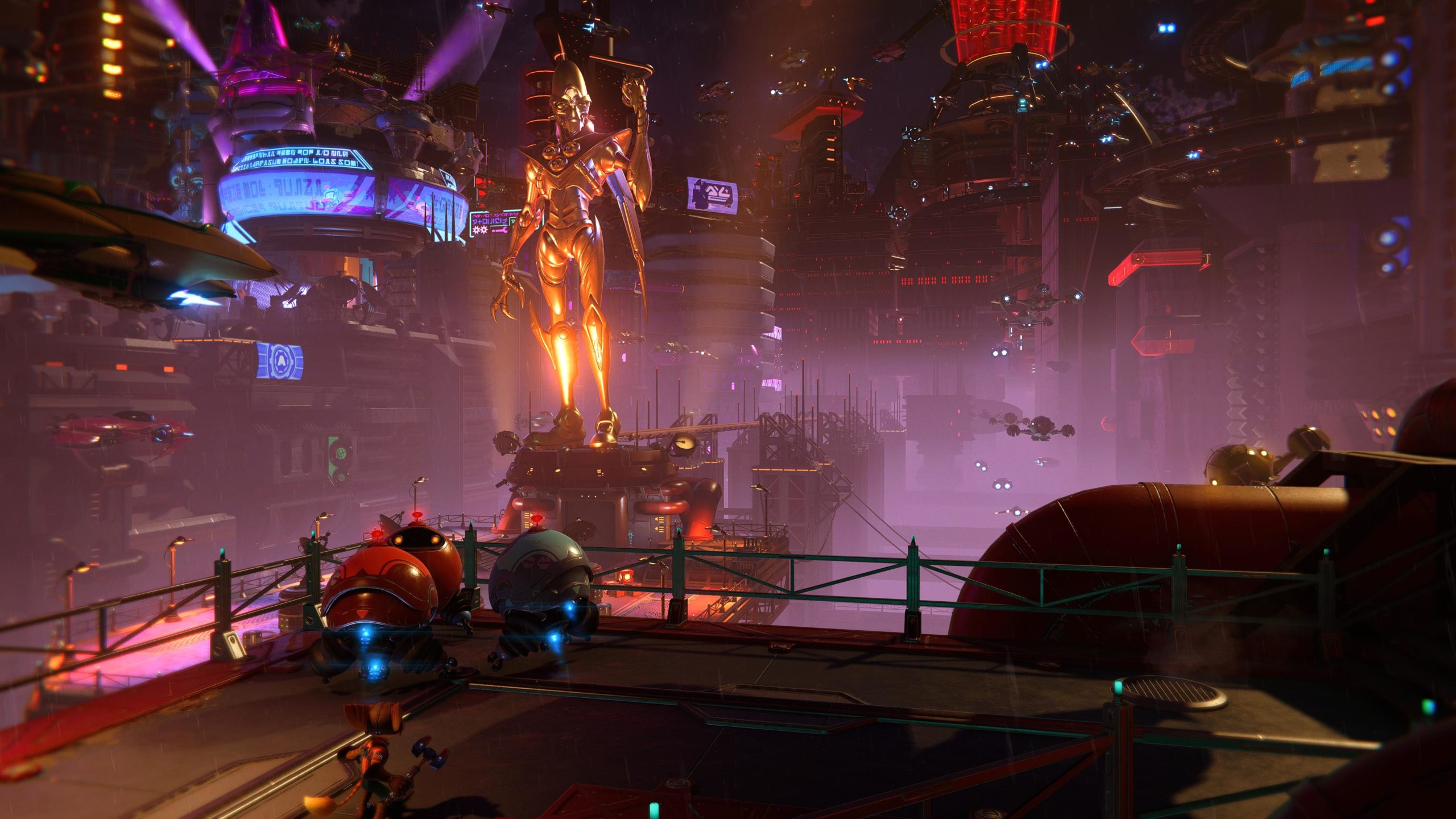 Playstation nous avait prévenu : Ratchet et Clank serait une exclusivité PS5 qui exploiterait à fond toute la puissance de leur nouvelle console… Et c’est bien le cas. Dès les premières images du jeu, bien installé devant votre TV 4K HDR, vous serez bluffé par la beauté des images. C’est une vrai claque, une explosion de la rétine. Tout est beau ! Dès le départ du jeu, vous avez la possibilité de régler votre expérience de jeu et de choisir entre la 4K à 30 fps, le mode performance à 60 fps et le mode Performance RT, qui jongle entre les deux. Pour ma part, j’ai sélectionné le mode « Qualité » (4K, 30fps et Ray-Tracing) et OUI c’est sublime et NON 30fps ce n’est pas injouable. Quand notre héro débarque dans de somptueux décors, je suis toujours frappé par la profondeur de champ et de cette vie qui est donnée à chaque élément. Une expérience bien souvent gâché dans certains jeux par les temps de chargement mais le SSD de la PS5 montre la tout son intérêt. Les missions, l’exploration et l’aventure de nos héros s’enchainent sans aucun temps mort. Pas de pause, pas de chargement visible : toute l’expérience de jeu est d’une fluidité sans nom. Si un fondu au noir peut apparaitre à certain moment, il dévoile un nouveau monde avant que vous n’ayez pu cligner des yeux.