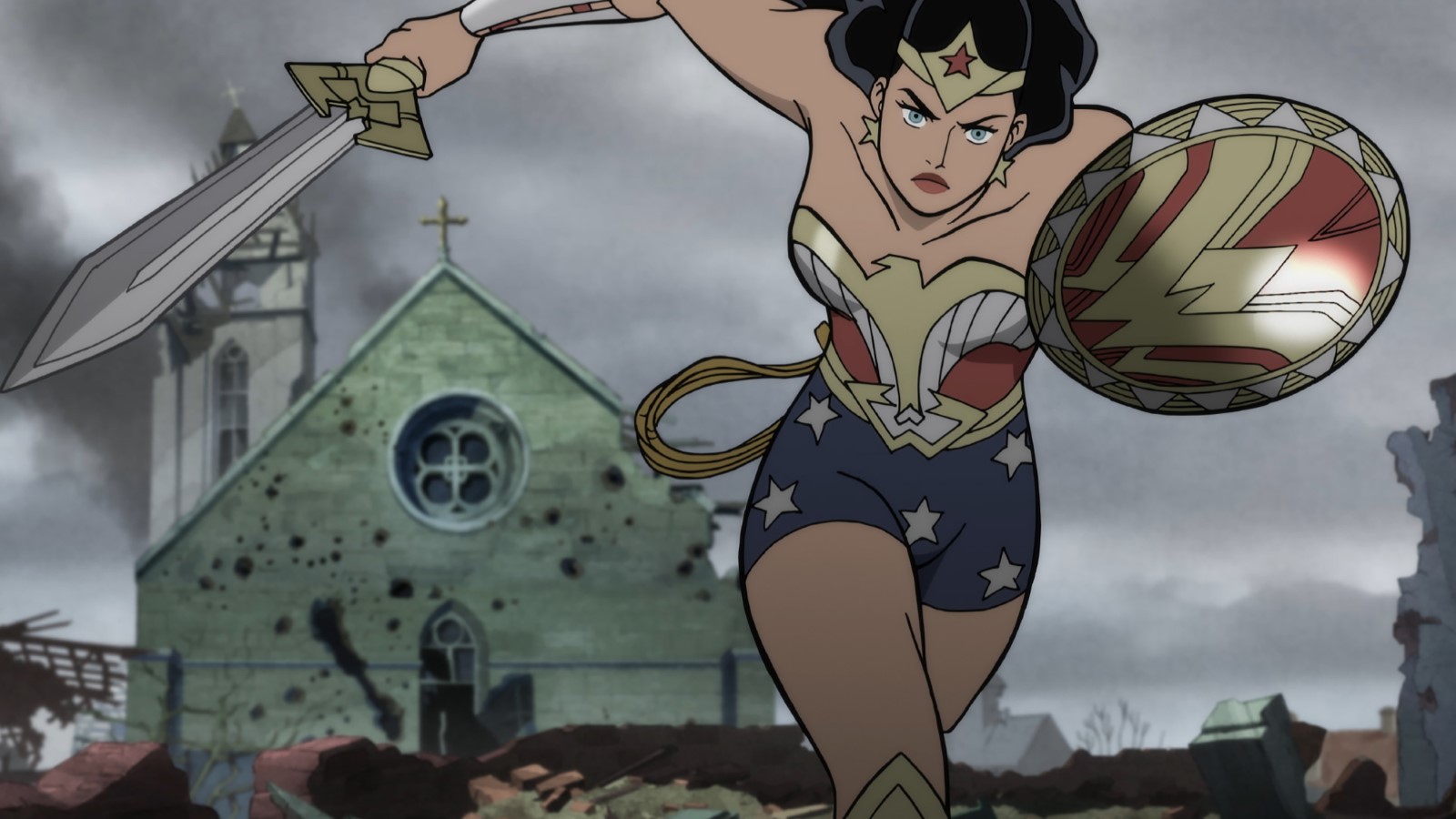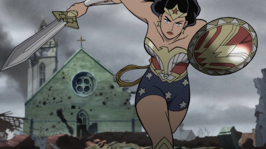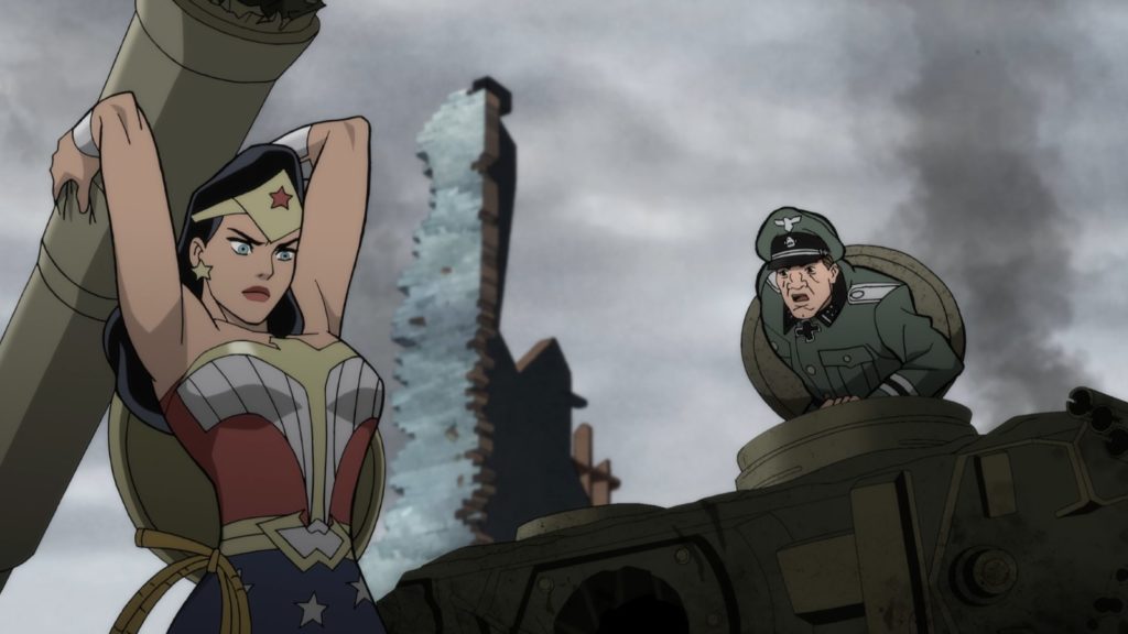 Contrairement à ce que je pouvais imaginer, Justice Society : World War II est bien plus complexe que je ne l’imaginais et je n’ai pu anticiper certains rebondissements du scénario. Bien ficelé, il vous mènera dans une formidable aventure ou chacun des héros de la JSA, ainsi que notre Flash, devra faire preuve de courage et affronter l’adversité. Non, tout n’est pas focalisé sur Flash et Wonder Woman est tous auront le droit à la « moment de gloire » avec des passages « vraiment badass » pour certains ! De plus, notre JSA croisera la route d’autres personnages de l’univers DC mais ça, c’est une surprise… Chut… Graphiquement, on aimera ou nous la direction artistique mais pour moi, c’est un grand OUI. J’aime beaucoup ces personnages bien carrés et aux lignes extérieures très marquées. Les couleurs sont aussi plus pales, moins flashy et collent très bien avec la période obscure de la Seconde Guerre Mondiale. Et puis, j’ai eu un gros coup de cœur pour le personnage de Wonder Woman ici et la façon dont il a été traité. Elle est athlétique, ne porte pas une tenue trop sexy avec son short taille haute et elle a même des formes. Wonder Woman est aussi présenté comme une femme forte, au caractère bien trempé et n’hésitant pas une seconde à foncer dans le tas. Petit plus, son accent. Pas de charmante petite voix de pin-up mais une fois avec un fort accent étranger, ce qui est assez logique pour une Amazone. Enfin, notons qu’une fois encore, Dc Comics et Warner Bros Animation ont fait le choix de proposer un animé « pour adultes ». Si certains préfèrent opter pour le tout public, Justice Society : World War II nous offre des combats, des coups, du sang et la mort.